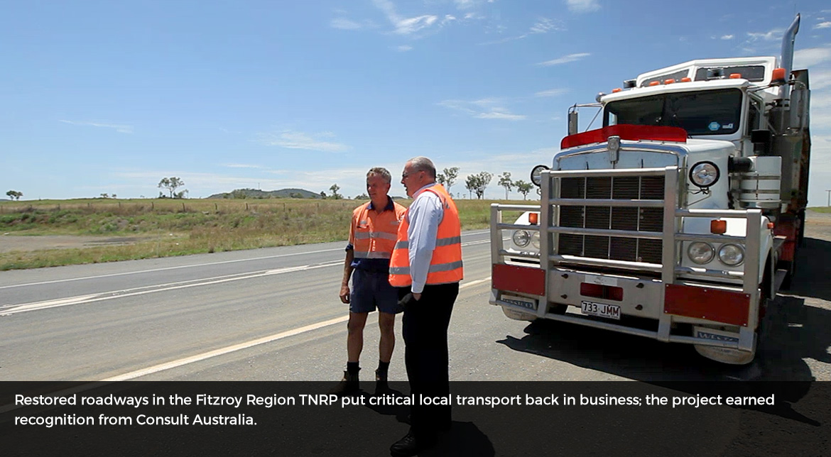 The Fitzroy Region reconstruction program was successfully completed both in advance of the deadline and under budget. It was recently recognized with a Highly Commended award in the collaboration category from Consult Australia.