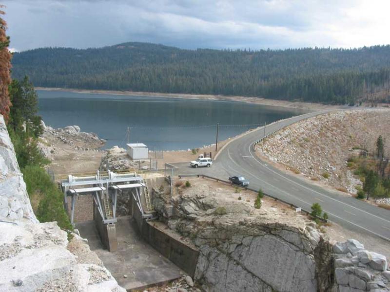 Aerial photo of the project featuring the spillway and French Meadows Reservoir.