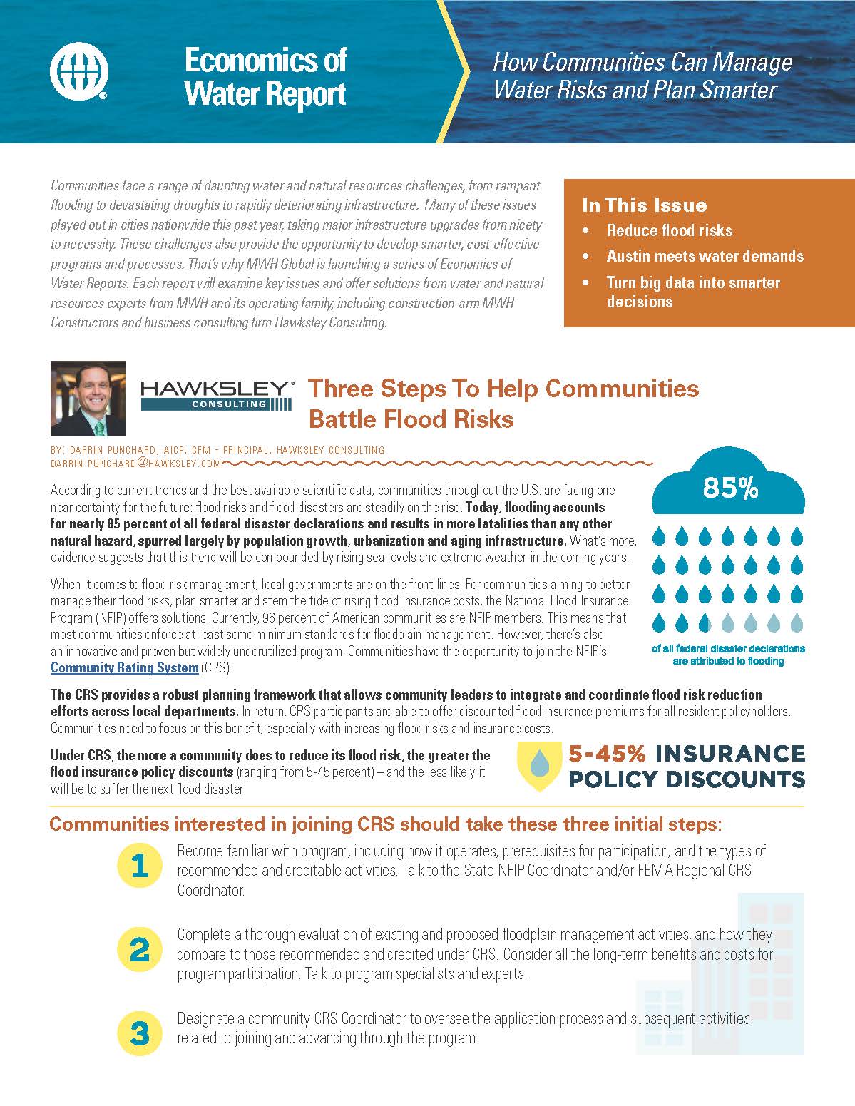 Communities face a range of daunting water and natural resources challenges, from rampant flooding to devastating droughts to rapidly deteriorating infrastructure. Many of these issues played out in cities nationwide this past year, taking major infrastructure upgrades from nicety to necessity. These challenges also provide the opportunity to develop smarter, cost-effective programs and processes. That’s why MWH Global is launching a series of Economics of Water Reports. Each report will examine key issues and offer solutions from water and natural resources experts from MWH and its operating family, including construction-arm MWH Constructors and business consulting firm Hawksley Consulting.
