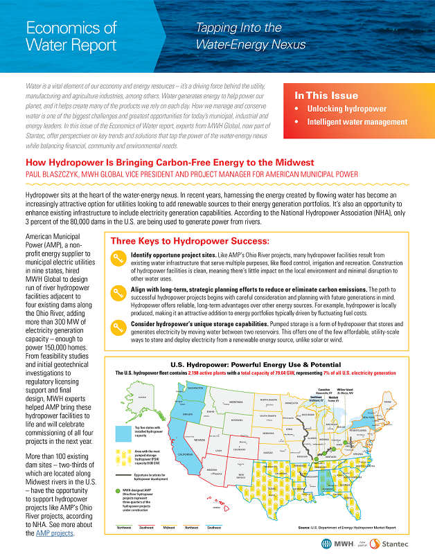 Water is a vital element of our economy and energy resources – it’s a driving force behind the utility, manufacturing and agriculture industries, among others. Water generates energy to help power our planet, and it helps create many of the products we rely on each day. How we manage and conserve water is one of the biggest challenges and greatest opportunities for today’s municipal, industrial and energy leaders. In this issue of the Economics of Water report, experts from MWH Global, now part of Stantec, offer perspectives on key trends and solutions that tap the power of the water-energy nexus while balancing financial, community and environmental needs.