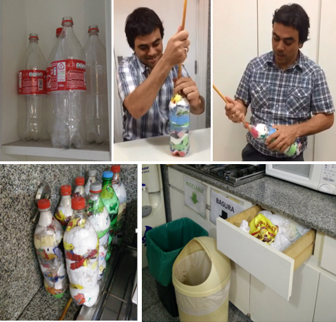 To promote this initiative in the office, some empty plastic bottles have been placed in the kitchen with the purpose of being filled by the employees who are asked to collect daily the plastic bags / wrappings they use in the office or in their homes.