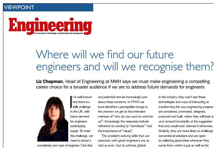 Liz Chapman, Head of Engineering at MWH in the UK recently shared her thoughts with Engineering Magazine and explains why she believes it is our responsibility to resolve the UK’s skills shortage by attracting a diverse range of young people with creative flair and a thirst for problem solving to mold into the next generation of engineers.